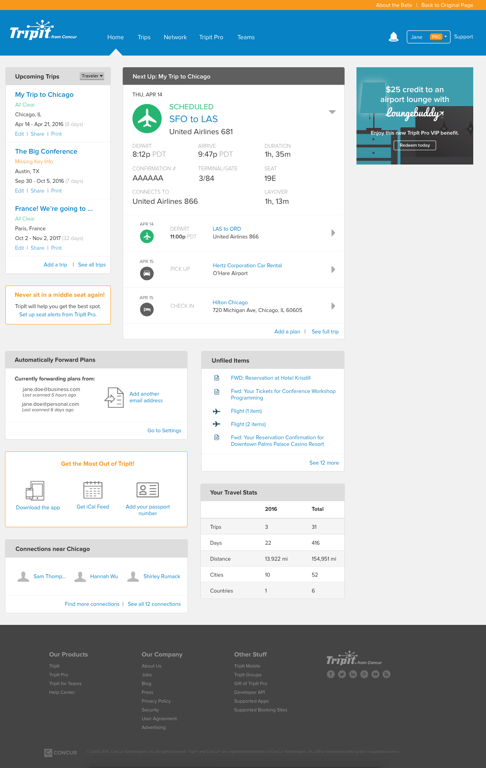 The biggest problem is design fragmentation. The TripIt team quickly redesigned, rebuilt, and released the signed-in homepage, Pro dashboard, and Trips page. Business priorities changed, and progress on the webapp stalled. When I left the company, we had only fully redesigned a small percentage of our web app. While the initial experience is an improvement, the overall experience is arguably worse. The design abruptly shifts multiple times in the middle of simple tasks. See for yourself by making a free account.